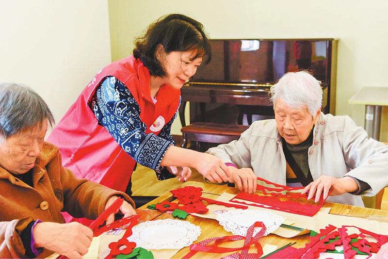 四川老年大学开展公益志愿活动,银龄志愿者陪同高龄老人学习剪纸。省老龄办供图