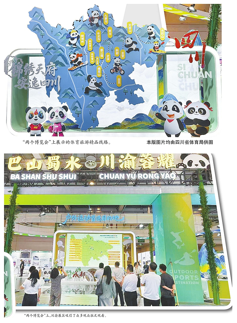 长江、嘉陵江蜿蜒之势串联川渝山水,重庆山地攀岩、四川九寨徒步、万州横渡长江系列赛、冰雪运动、梁平低空运动等特色运动场景逐一呈现,展现自然与体育的浑然天成之美。这是此次“两个博览会”四川省体育局、重庆市体育局、成都市体育局展区“三同二十六新”的《山水同辉·悦动之旅》板块展出的内容——在这座由四川文化传播有限公司精心打造的400余平方米主题展馆中,四川、重庆、成都三家体育行政部门通过《山水同辉·悦动之旅》《文脉同承·匠心之韵》《双圈同擎·活力之芯》三大核心板块,生动展现巴蜀体育文明的千年传承与创新表达,重点打造“户外运动首选目的地”的诗意远方与强劲经济动能,展示川渝18条中国体育旅游精品线路与共创的赛事IP等,体现“科技+体育”的产业融合,并通过沉浸式体验区、非遗展演等形式,全面彰显科技赋能下全民健身的蓬勃生机与融合创新,立体化、全方位地呈现巴蜀体育的过去、现在与未来。