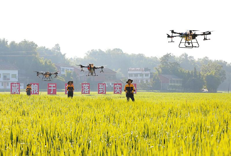 藏粮于技,图为大竹县童家镇水稻制种基地内植保无人机飞防服务。 王巍 摄