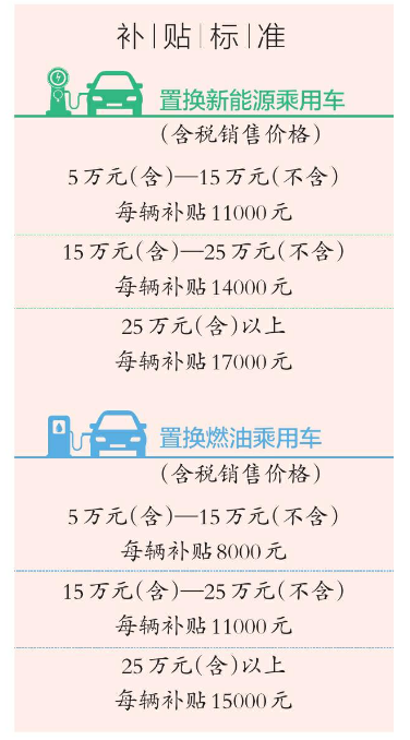 购买燃油乘用车的,含税销售价格5万元(含)—15万元(不含)的,每辆补贴 8000 元;15 万元(含)—25万元(不含)的,每辆补贴11000元;25万元(含)以上的,每辆补贴15000元。