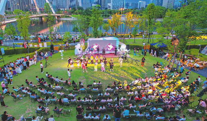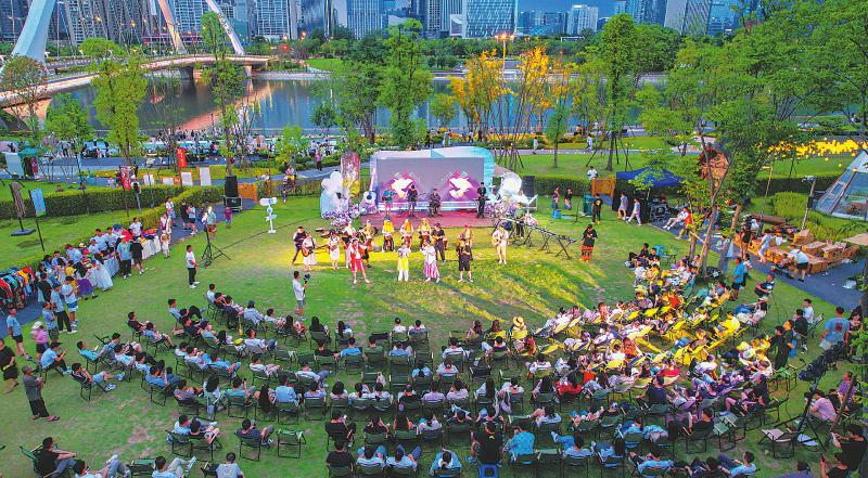 6月21日,成都市锦江区,市民在交子VC露营基地品美食、玩音乐、赏夜景,乐享休闲夜生活。文瑞 摄(C视觉)