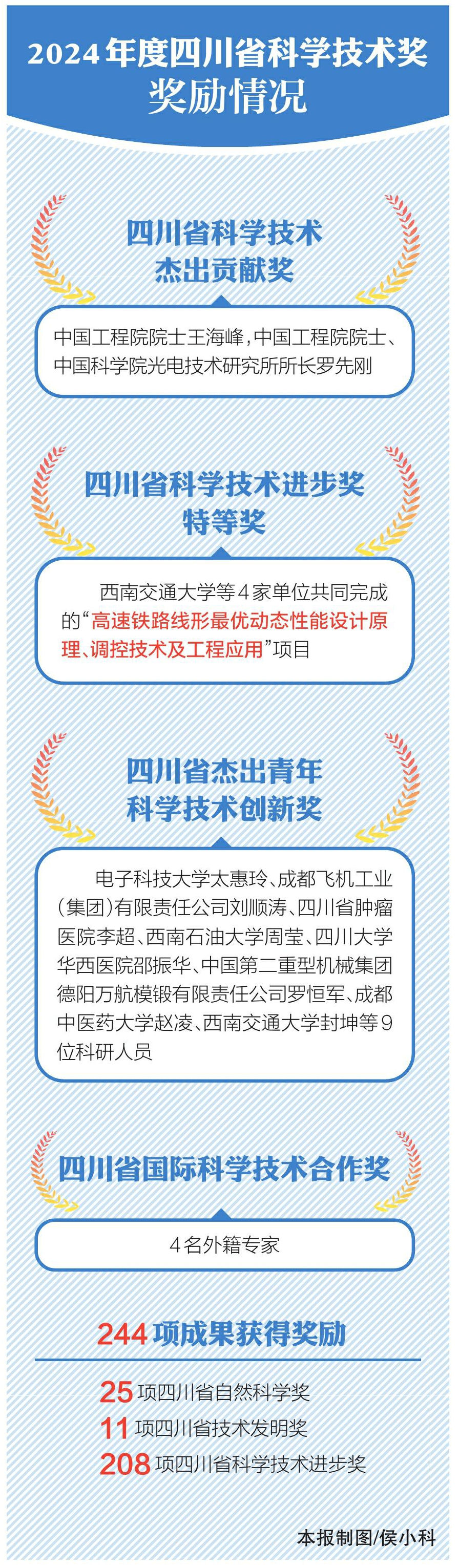当天,2024年度四川省科学技术杰出贡献奖授予了两位科学家,分别是中国工程院院士王海峰,中国工程院院士、中国科学院光电技术研究所所长罗先刚。9位科研人员获得四川省杰出青年科学技术创新奖;4名外籍专家获得四川省国际科学技术合作奖;244项成果获得奖励,包括25项四川省自然科学奖、11项四川省技术发明奖以及208项四川省科学技术进步奖。值得一提的是,时隔8年,四川省科学技术进步奖特等奖再次颁出。