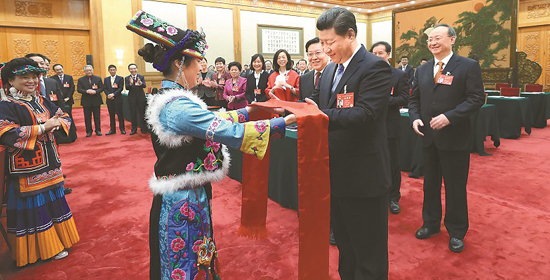 三月八日,中共中央总书记、国家主席、中央军委主席习近平来到十二届全国人大五次会议四川团参加审议。雅安市汉源县永利乡古路村支部书记骆云莲代表用照片向总书记展示灾区重建的新貌。习近平起身接过照片,仔细看了起来,说:“非常高兴,浴火重生!”记者 毛漫丁 摄
