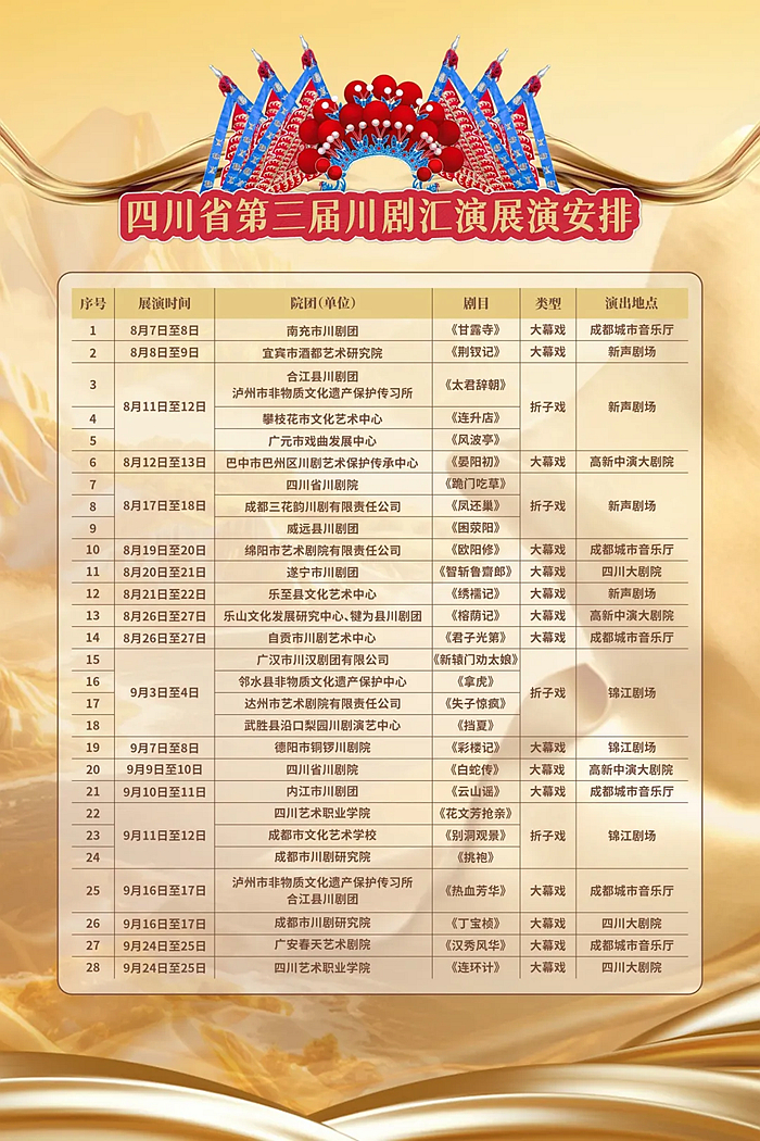 本届活动是如何安排的呢?据介绍,本届活动由中共四川省委宣传部、文化和旅游厅、省文联主办,四川省戏剧家协会、四川省艺术创作促进中心(四川省艺术基金中心)、四川天府演艺集团承办,总体时间从8月持续到春节前,分为三个阶段:一是8月至9月,集中开展剧目展演评比;二是10月至12月,陆续开展文旅宣推、省外巡演、新媒体传播等系列活动;三是2026年春节前,举办汇报演出暨颁奖活动。