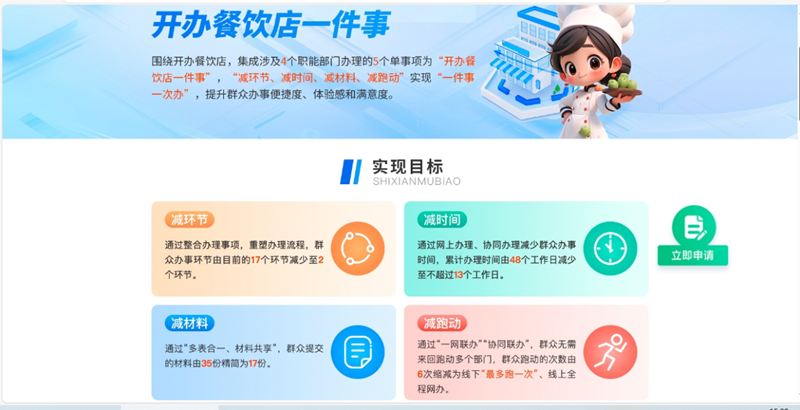 按照国家要求,在四川政务服务网开通“高效办成一件事”服务专区,聚合了14项个人、企业高频热点事项的办事服务信息,打造“一件事”线上服务统一入口。通过办理模式创新,将原串联办理事项转变为并联办理,以“开办餐饮店一件事”为例,申请表单要素从100个压减到58个,申请材料由35份压缩为17份,办理时限由48个工作日压减为13个工作日,真正实现了让“数据多跑路、群众少跑腿”。(记者 陈松)